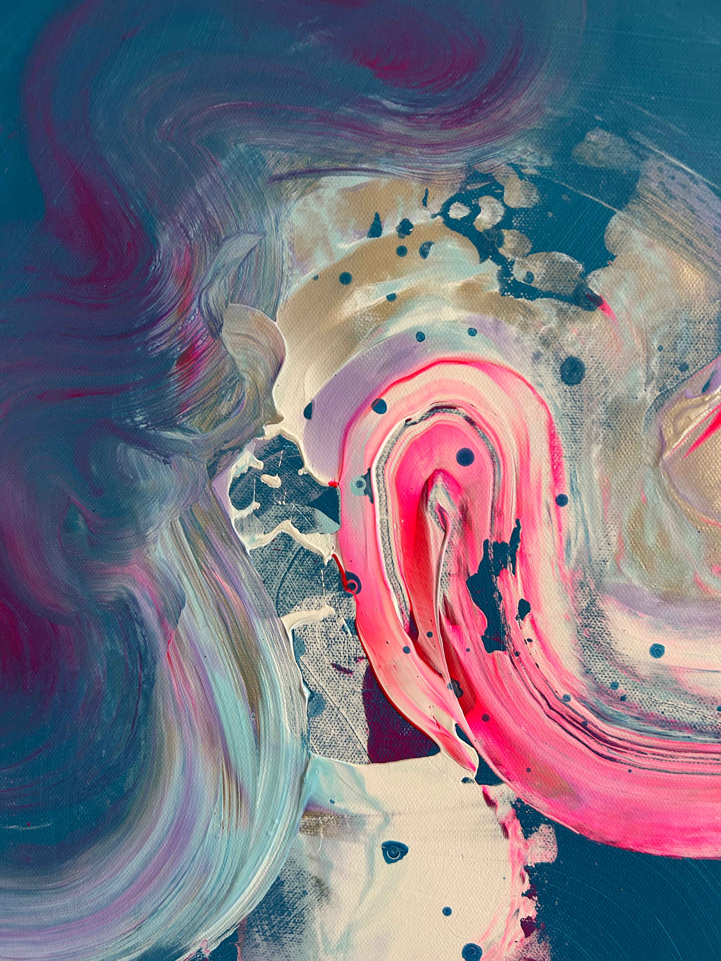 After a months long burn out and a long break from painting in 2024, Dhesi demonstrates her emotional transformation by abandoning her usual choice of a dark color palette and dreary subjects, in favor of the bright and abstract. For this Amsterdam-based artist, there is no separation of the art from the artist. Dhesi always lets her Soul guide her creative process, and finds herself surprised by the final result each time. The latest series of abstract paintings are a reflection of her personal rebirth: she finds herself completely disinterested in the darker matters she was previously so drawn to. The bright colors interweave with each other in delicate lines, or dominate the canvas with bold splashes of color. The vigor emanating from the canvas reminds us of the often exhausting, and sometimes even violent, process of personal change. And yet, the energetic orchestra of colors and shapes reminds us that this change can breathe new life into us, expanding our lungs.